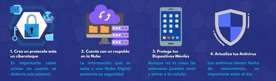 En la actualidad las empresas son víctimas de ciberataques, debido a que los hackers andan en búsqueda de robo de información. Se aprovechan de la desinformación sobre medidas de prevención para un ciberataque dejando vulnerables nuestros dispositivos, información, archivos, etcétera. Para evitar ser una víctima de ciberataques es importante identificar a qué riesgos estamos expuestos en el ambiente digital. Te compartimos unos tips de ciberseguridad de cómo prevenir un ciberataque.